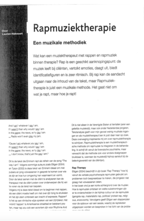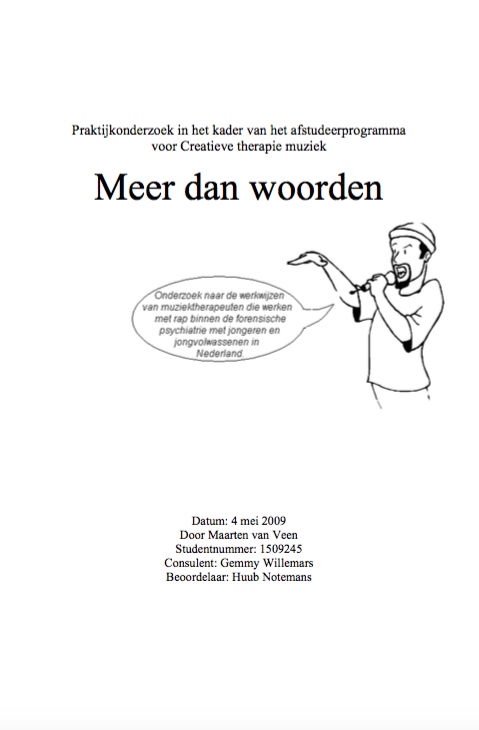 Bis heute scheint es keine Veröffentlichungen auf Deutsch, Holländisch oder Englisch über Kombinationsmöglichkeiten von Rapmusik, Musiktherapie und der kognitiven Verhaltenstherapie zu geben. Hier habe ich jedoch ein paar Bücher, Artikel, Abschlussarbeiten zu den einzelnen Teilbereichen: – Rap und Gesprächstherapie – Rap in der Musiktherapie – Rap/Hip Hop und Psychologie zusammengefasst, die mich bei meiner bisherigen Arbeit begleitet haben (für mehr Literatur siehe unten):